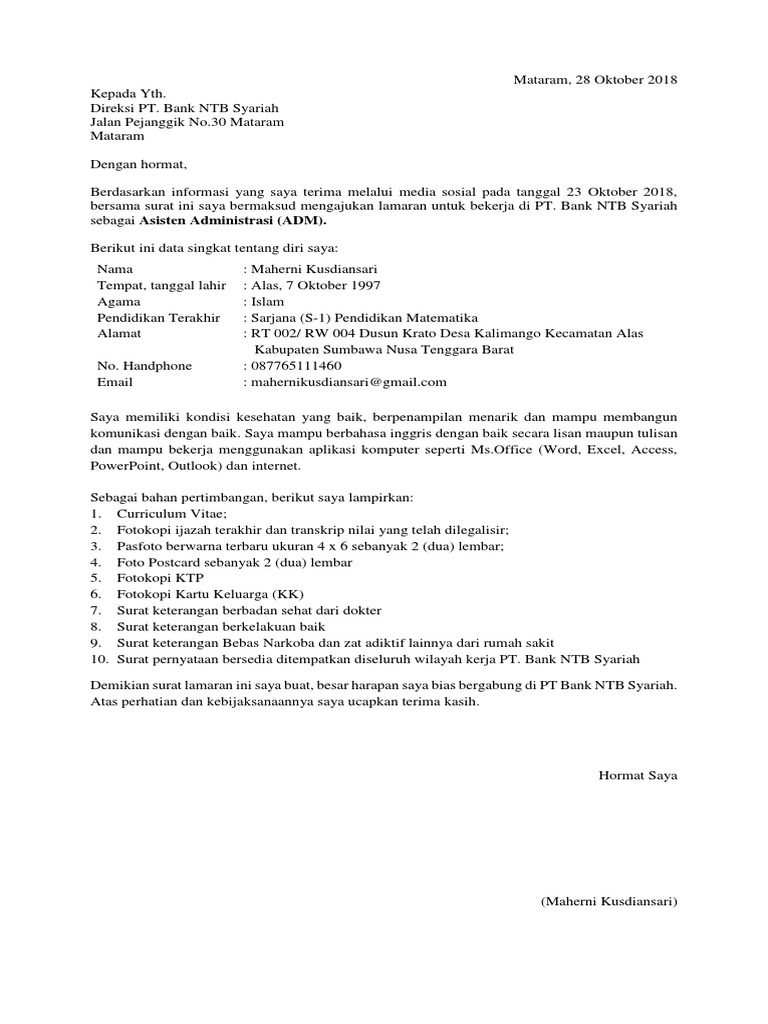 Dengan contoh surat lamaran kerja yang tepat akan memudah kamu dalam membuatnnya. Bank bukopin cabang palangkaraya membutuhkan karyawan yang sudah berpengalaman di industri perbankan, untuk itu. Apalagi bila anda sudah berkeluarga dan anda adalah seorang suami. Direktur bank rakyat indonesia (bri) jakarta pusat. Maka, tentu bekerja menjadi hal yang wajib bagi anda. Sebenarnya, menulis surat lamaran kerja. Sahabat 99, apakah kamu sedang bersiap untuk masuk ke dunia kerja? Berikut ini contoh lengkap surat lamaran kerja berbagai instansi atau posisi. Untuk melamar pekerjaan di bank, maka anda harus menyiapkan beberapa berkas seperti cv, fotocopy transkrip nilai terakhir, fotocopy ijazah terakhir, surat pengalaman kerja, fotocopy skck, dan pas foto 3×4 yang terbaru. Contoh surat lamaran kerja tentunya berbeda beda jenisnya tergantung akan dikirim keperusahaan seperti apa , atau mau digunakan untuk melamar kerja di berikut contoh surat lamaran pekerjaan untuk bumn seperti pln , kai , pertamina , telkom , bank bri dan badan usaha milik negar lainnya. Surat lamaran kerja merupakan salah satu syarat untuk mendapatkan pekerjaan yang ingin anda dapatkan. Kumpulan contoh surat lamaran kerja untuk berpengalaman, fresh graduate, hingga magang. Pengertian surat lamaran, surat pengantar, surat motivasi merupakan sebuah surat pengantar yang melekat pada, atau yang menyertai dokumen lain misalnya … pencari kerja sering mengirim surat lamaran dan juga curriculum vitae untuk melamar pekerjaan kepada yth.